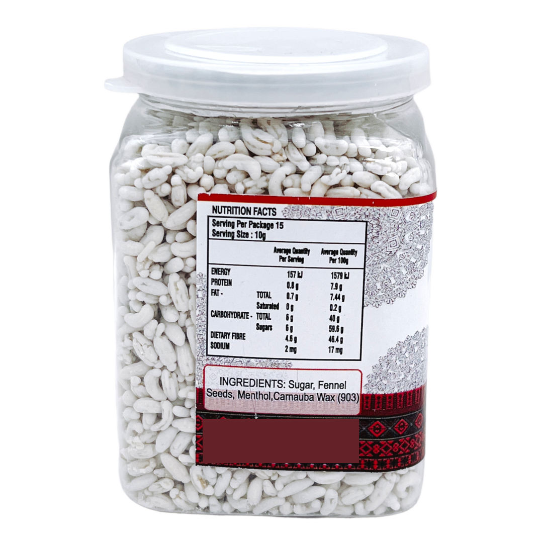The key ingredient of Madrasi White Fennel Candy is fennel seeds. Fennel seeds, known as "saunf" in Hindi, are widely used in Indian cuisine for their aromatic and digestive properties. These seeds are coated with a white, sugar-based syrup to create the candy's sweet and mildly spicy flavor profile. The sweet coating complements the slightly licorice-like taste of the fennel seeds, resulting in a candy that is both refreshing and satisfying.
