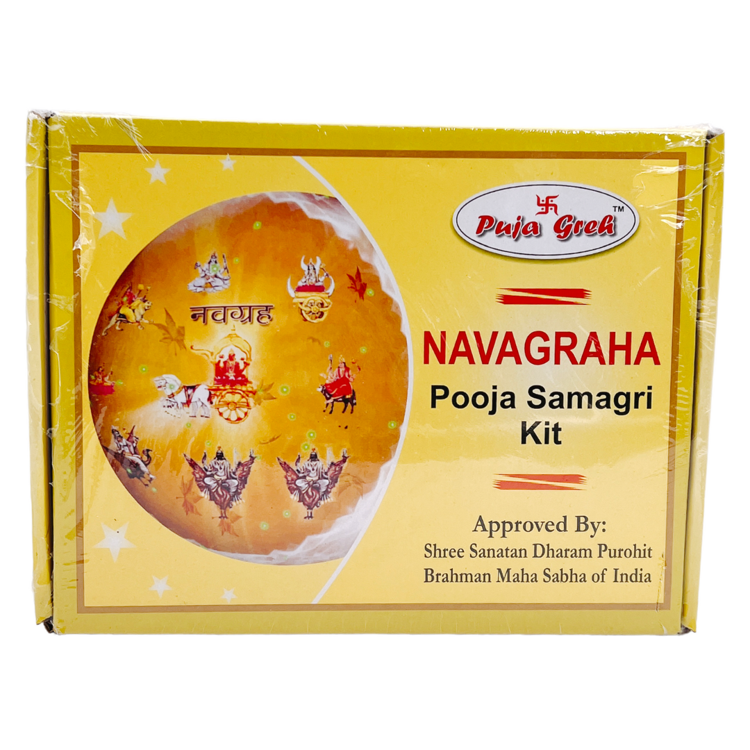 The kit typically includes a variety of items required for the worship of each specific planet. It often consists of idols or images representing the Navagrahas, a set of Navagraha Yantras (sacred geometric diagrams associated with each planet), grains, flowers, incense sticks, camphor, ghee (clarified butter), fruits, and other offerings. Additionally, the kit may contain specific herbs, leaves, and roots associated with the planets for use in the ritual.