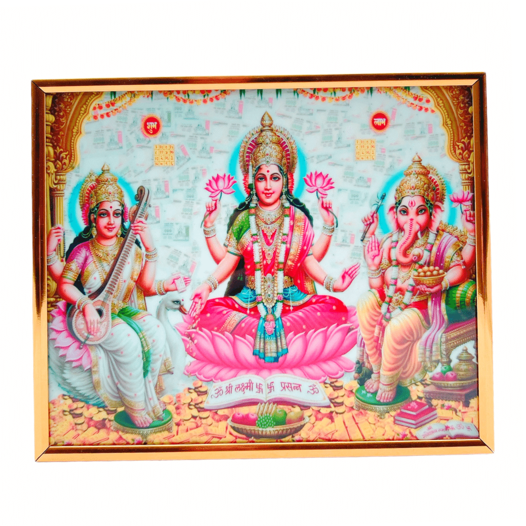 A Laxmi Ganesh & Saraswati Photo Frame is a sacred and artistic item that combines the images of three revered deities in Hinduism: Goddess Lakshmi, Lord Ganesha, and Goddess Saraswati. This unique frame is a symbol of prosperity, wisdom, and auspicious beginnings, making it a popular choice for religious and cultural purposes.