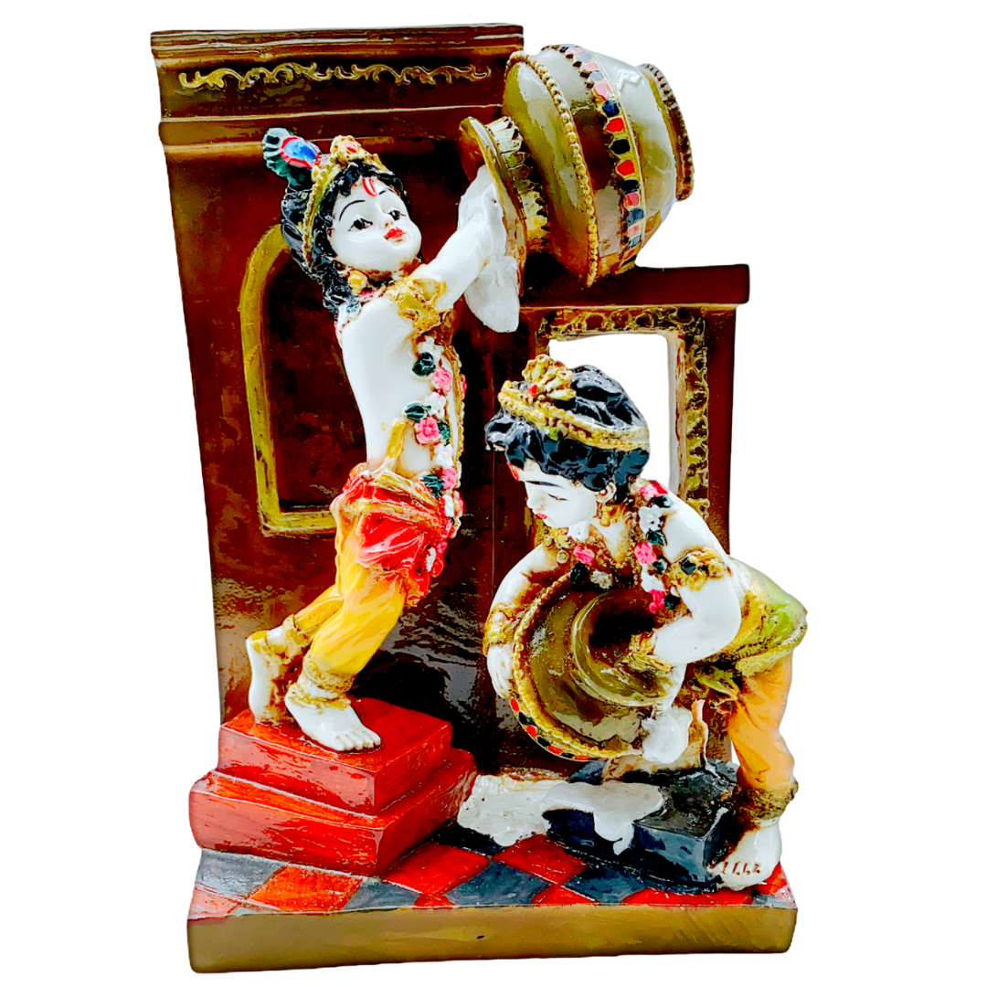 The Balarama-Krishna statue features Lord Balarama and Lord Krishna both stealing Makhan in a playful pose. They are adorned with exquisite jewelry, crowns, and vibrant garments. Devotees believe that worshiping this idol brings peace, prosperity, and spiritual fulfillment.