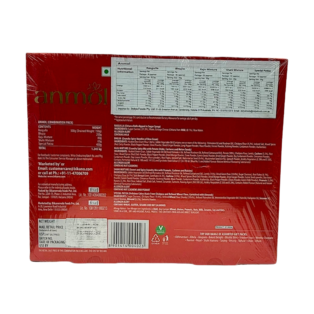 Bikano Anmol Gift Pack 1.245kg (Bikaneri Bhujia 200g, Kaju Mixture 80g, Shahi Mixture 65g, Patisa 400g, Royal Rasgulla 500g)