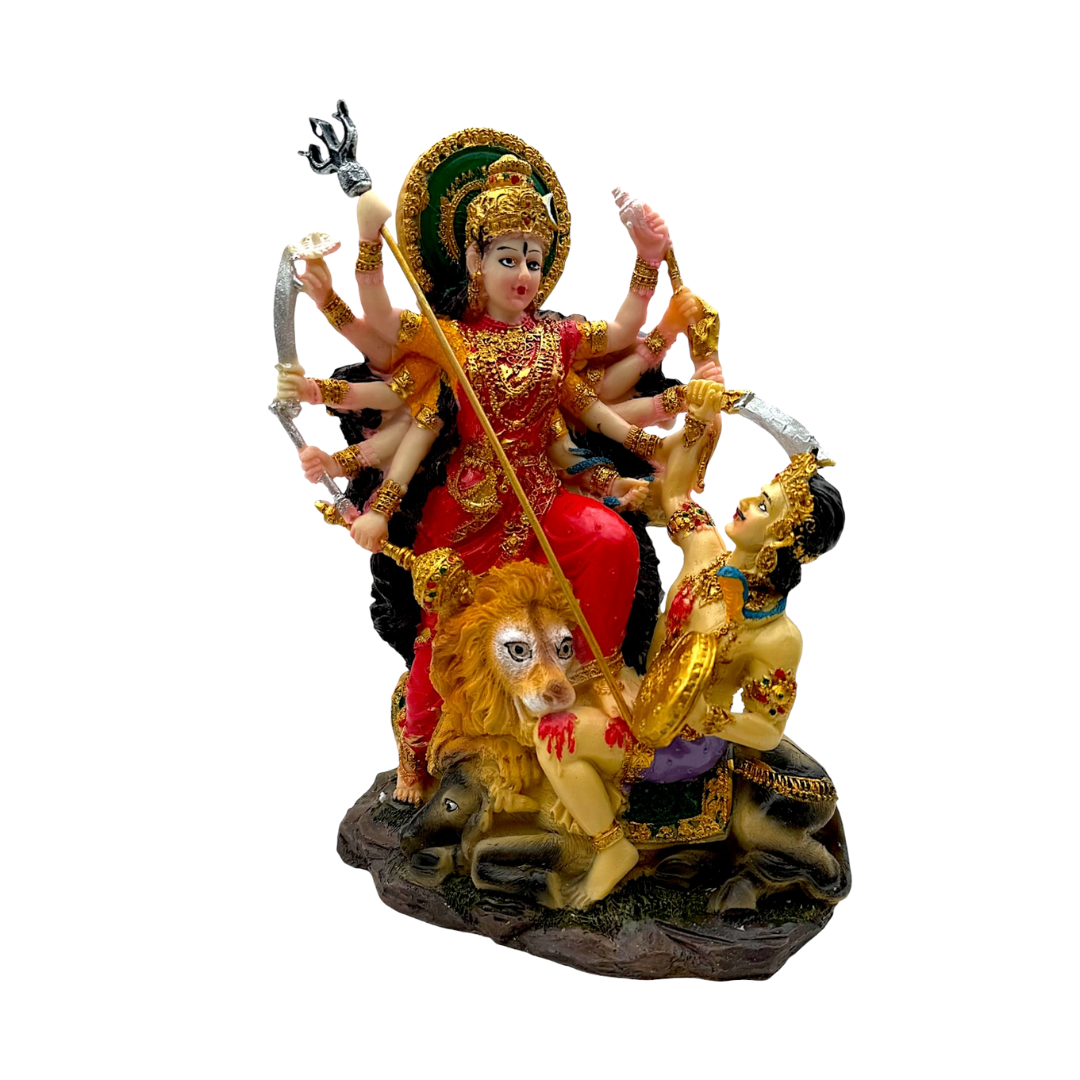 Celebrate the power and victory of Maa Durga with this beautifully crafted idol, depicting her in the Mahishasura Mardini form, seated majestically on a lion. This statue symbolises strength, protection, and triumph over evil, making it perfect for pooja rooms, festive décor, and gifting.