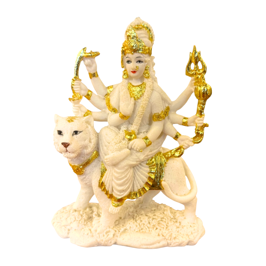 Product Name: Durga Mata – White Marble Look with Gold Highlights Idol/Statue/Murti