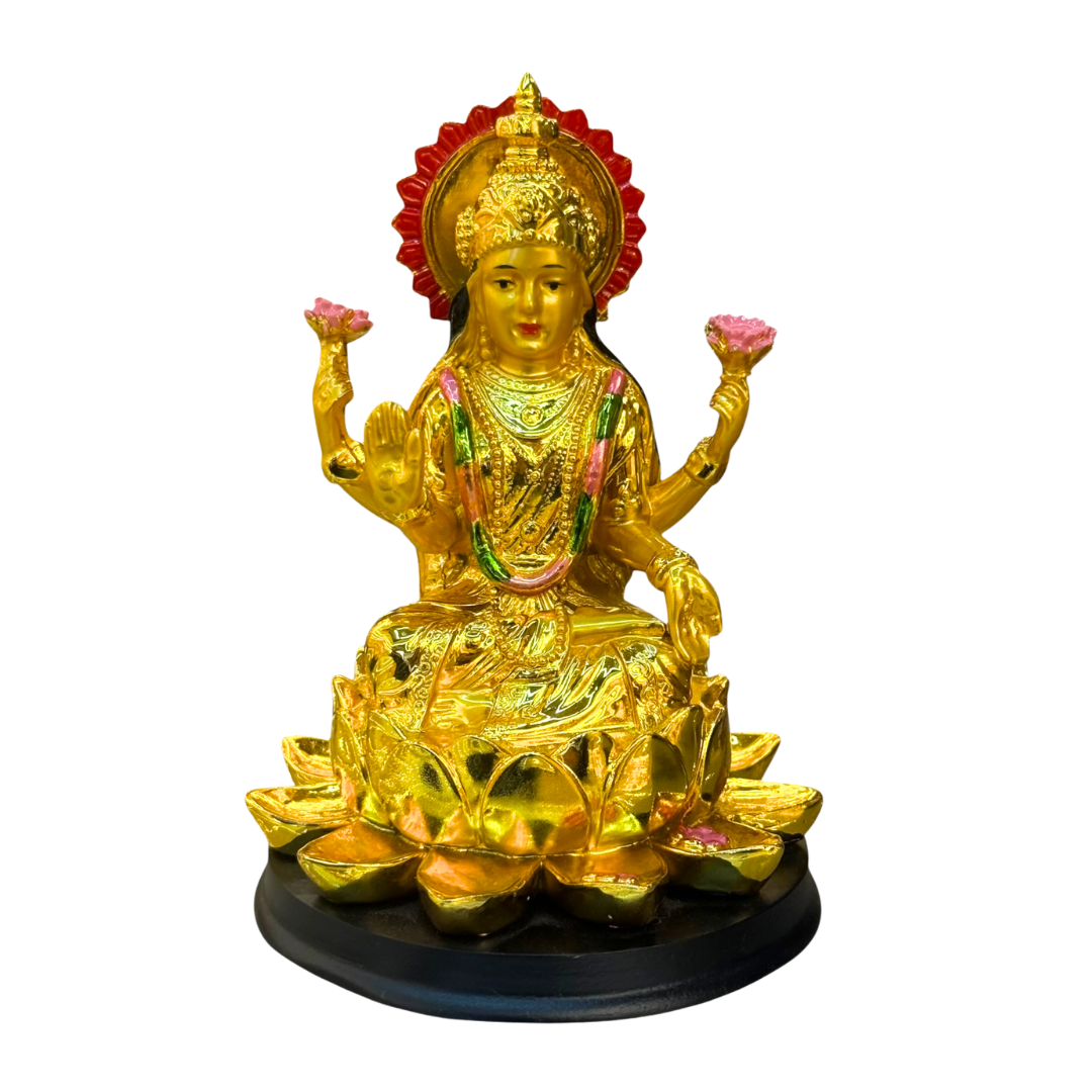 Design: Goddess Lakshmi in a gold finish, seated gracefully on a lotus base