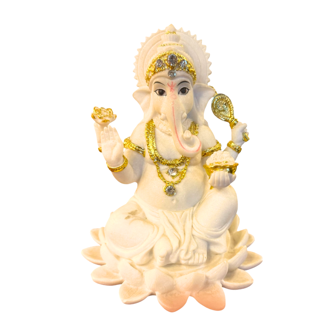 Design: Lord Ganesha seated on a lotus base with a white marble-look finish and golden accents