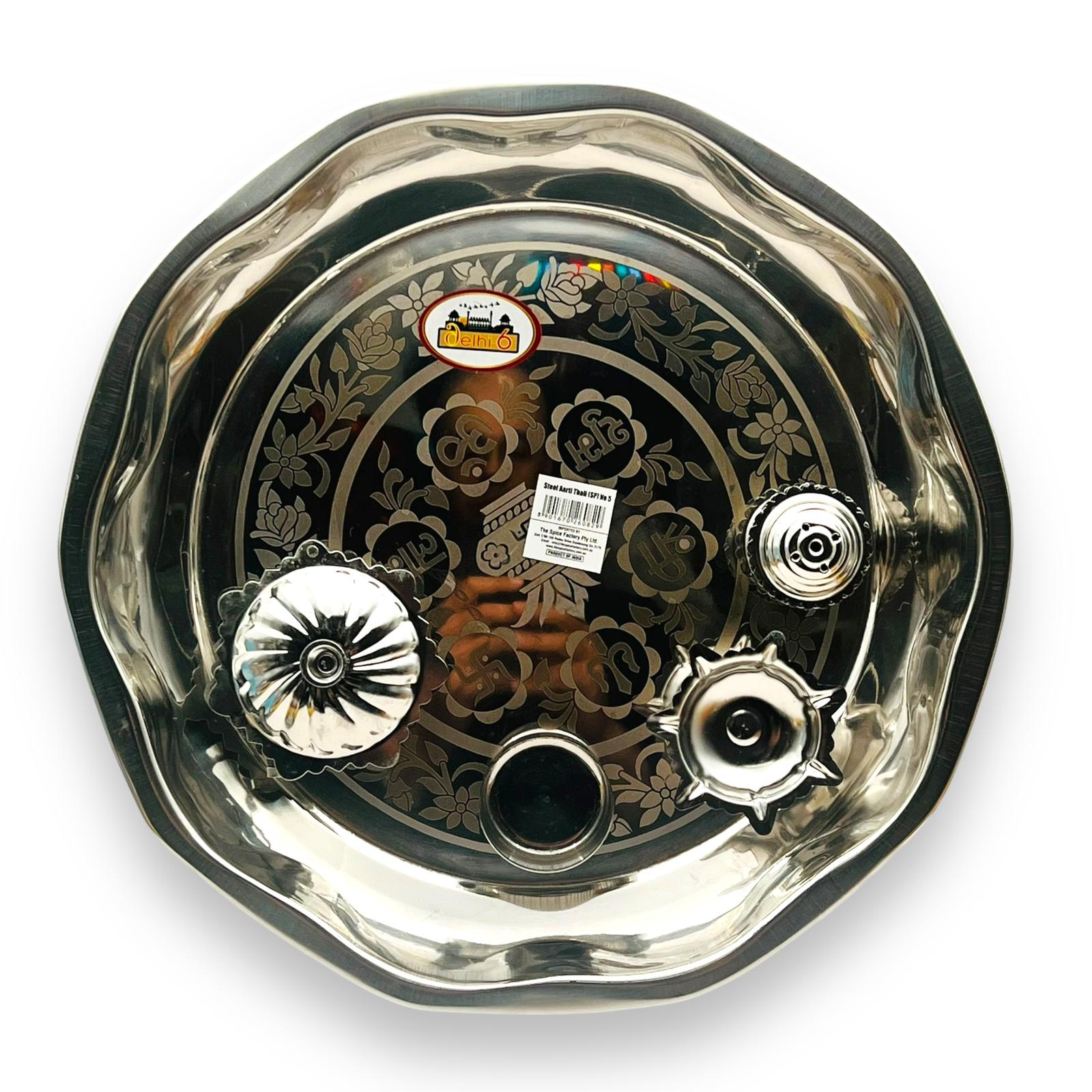 Printed Steel Aarti Thali is a traditional religious accessory that holds great significance in Hindu rituals and ceremonies. It is an elegantly designed plate made of high-quality stainless steel, adorned with intricate prints and patterns. The term "aarti" refers to a Hindu ritual where a plate, known as a thali, is used to hold various items for worship.